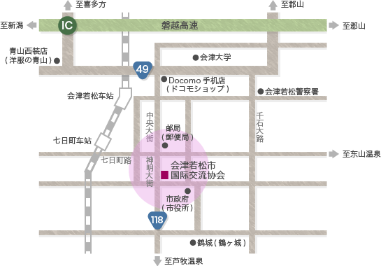 从会津若松车站出来后,经由中央大街,进入神明大街。本协会就在神明大街的中央地段的左侧大楼内。从车站步行约20分钟。