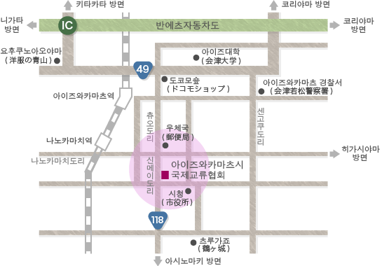 JR 아이즈와카마츠역을 나와서 츄오도리를 경유하여 신메이도리로 들어서면 중간정도 쯤에 왼쪽편으로 있는 건물입니다. 역에서 도보 약 20 분.