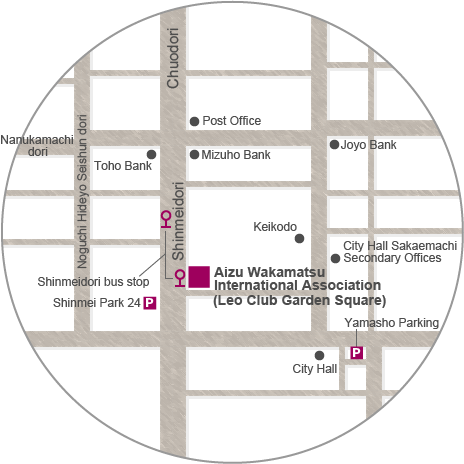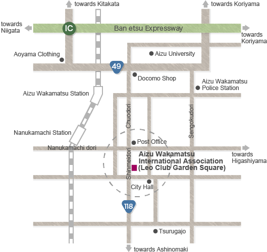 Từ ga JR AizuWakamatsu, bạn đi qua đường Chuuou (中央通り), rồi sẽ thấy tòa nhà phía bên tay trái nằm ở gần giữa đường Shinmei (神明通り). Thời gian di chuyển khoảng 20 phút nếu đi bộ từ ga tàu.